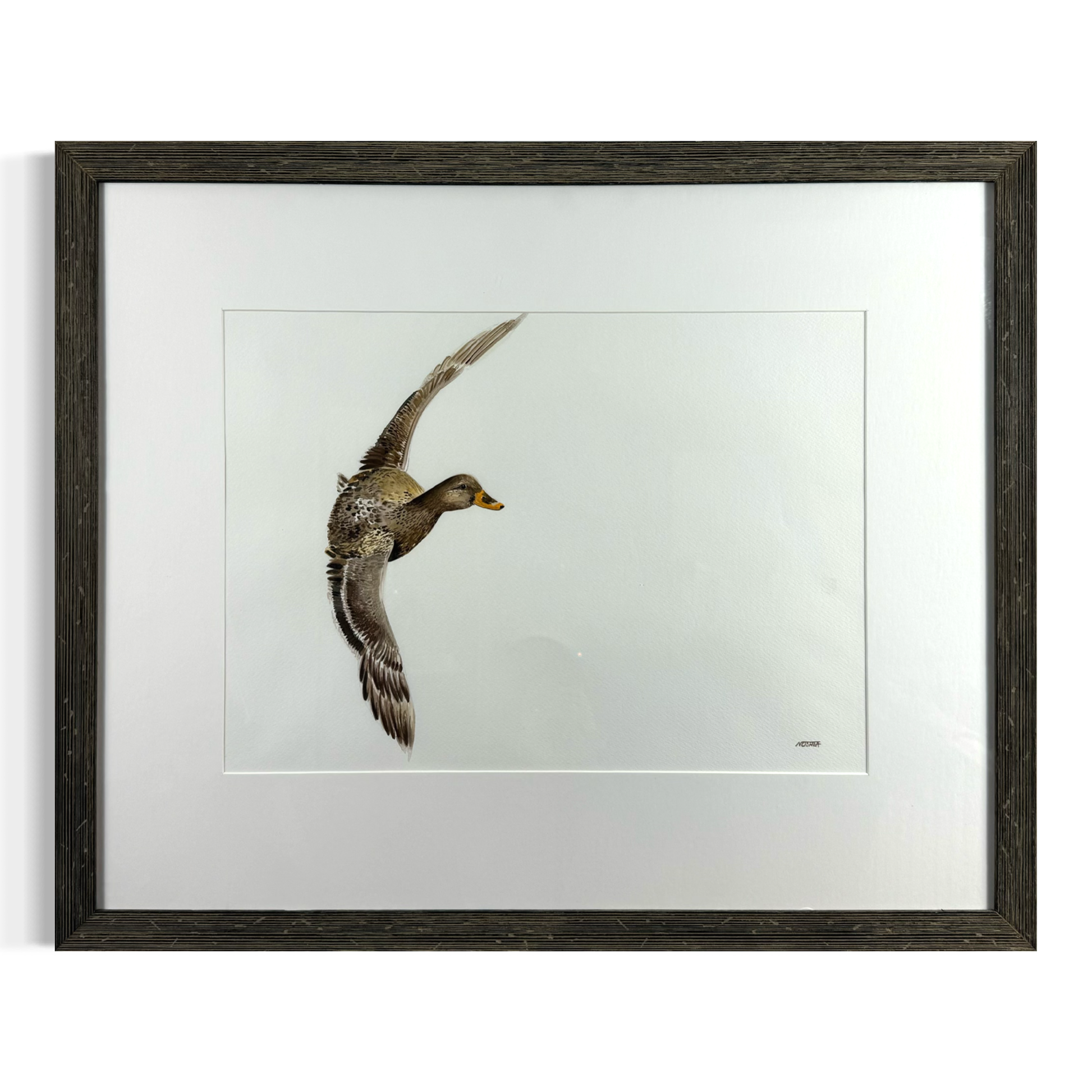 A graceful depiction of a hen mallard captured mid-flight, showcasing soft earth tones and natural feather detail. The upward wing position creates a sense of motion while maintaining a calm, refined presence.