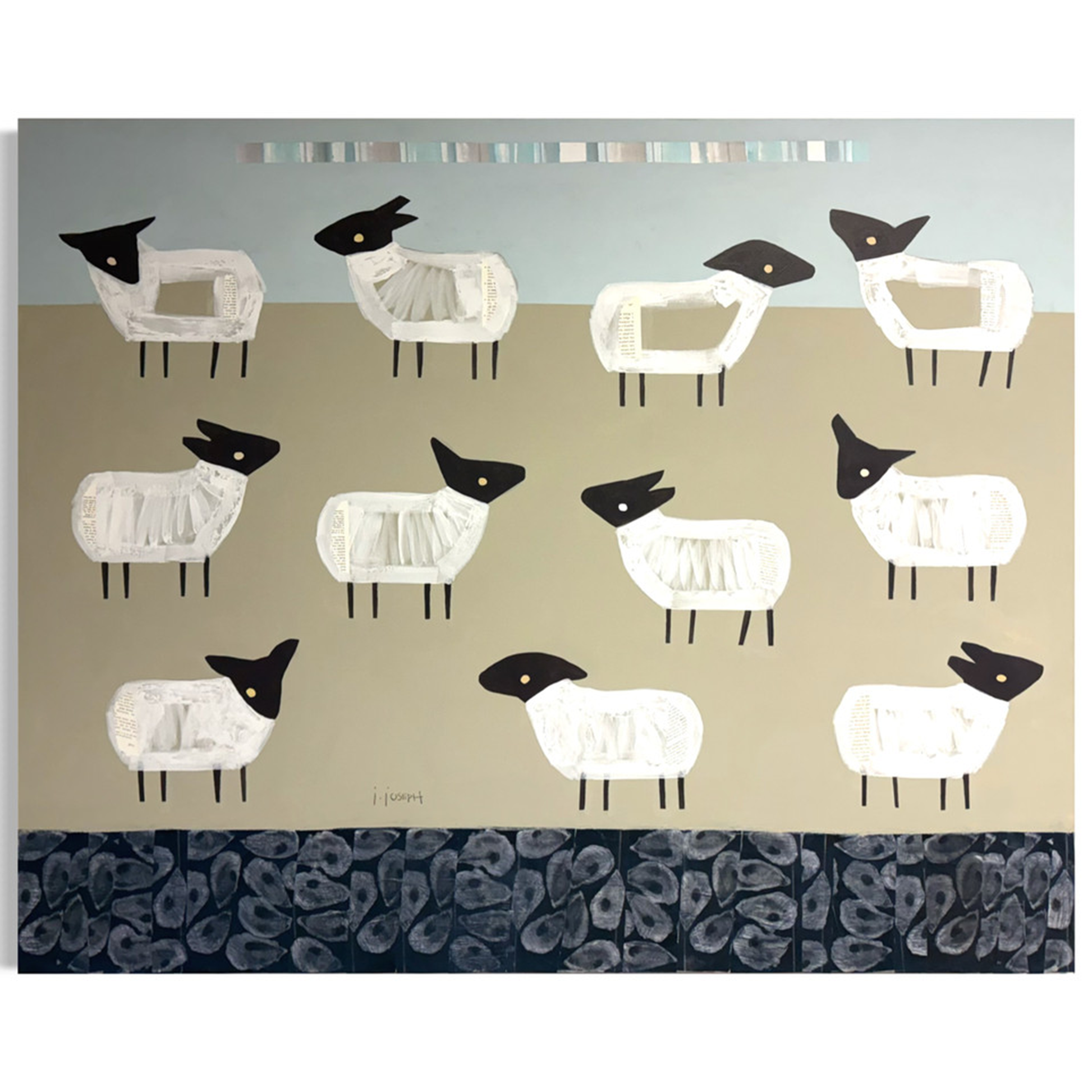 A playful depiction of sheep arranged in a rhythmic pattern, creating a sense of harmony and whismy.
