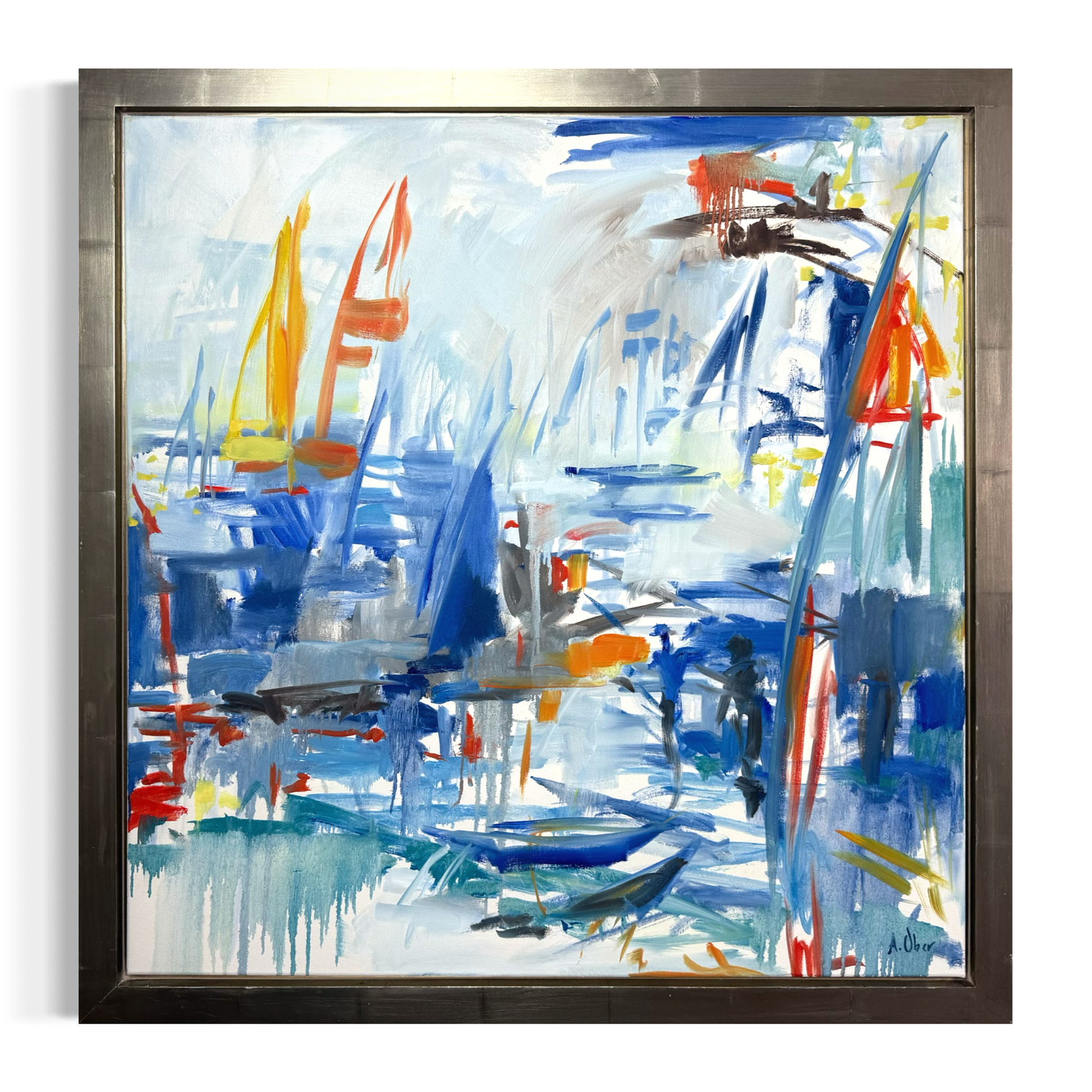 A vivid abstraction of sailing boats, capturing the essence of movement and water through bold brush strokes and vibrant colors.