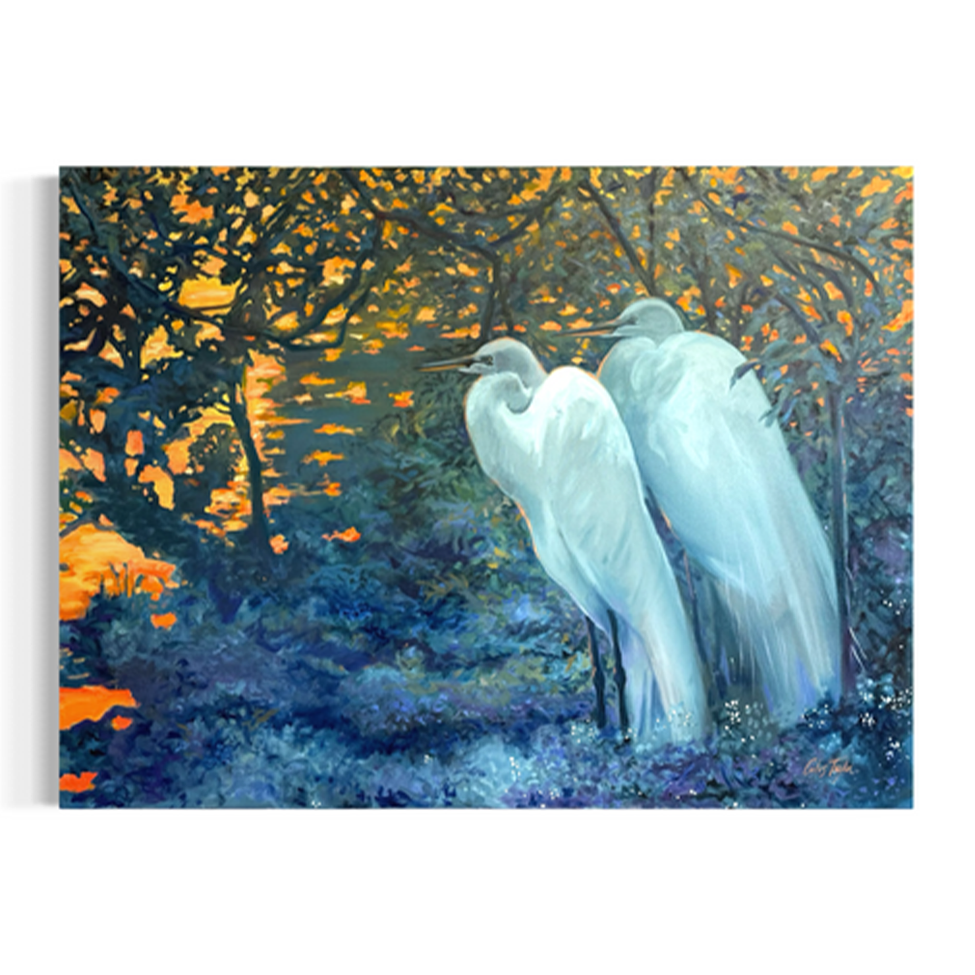 Two elegant egrets stand amidst a twilight setting, bathed in the soft glow of dusk. The interplay of light and shadow creates a serene, dreamlike atmosphere.